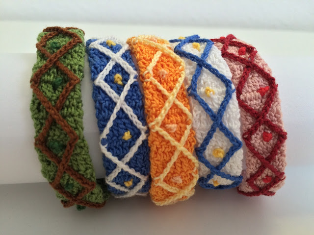 Inserire l’uncinetto in un angolo ad una estremità del bracciale e fare: 9 catenelle, contare 3 giri di punti alti, al lato opposto inserire l’uncinetto e fare 1 catenella. Ripetere per tutta la lunghezza del bracciale. Rifare uguale all’altro lato per ottenere la forma del rombo. Al centro di ogni rombo fare dei puntini con qualche punto di cucitura.